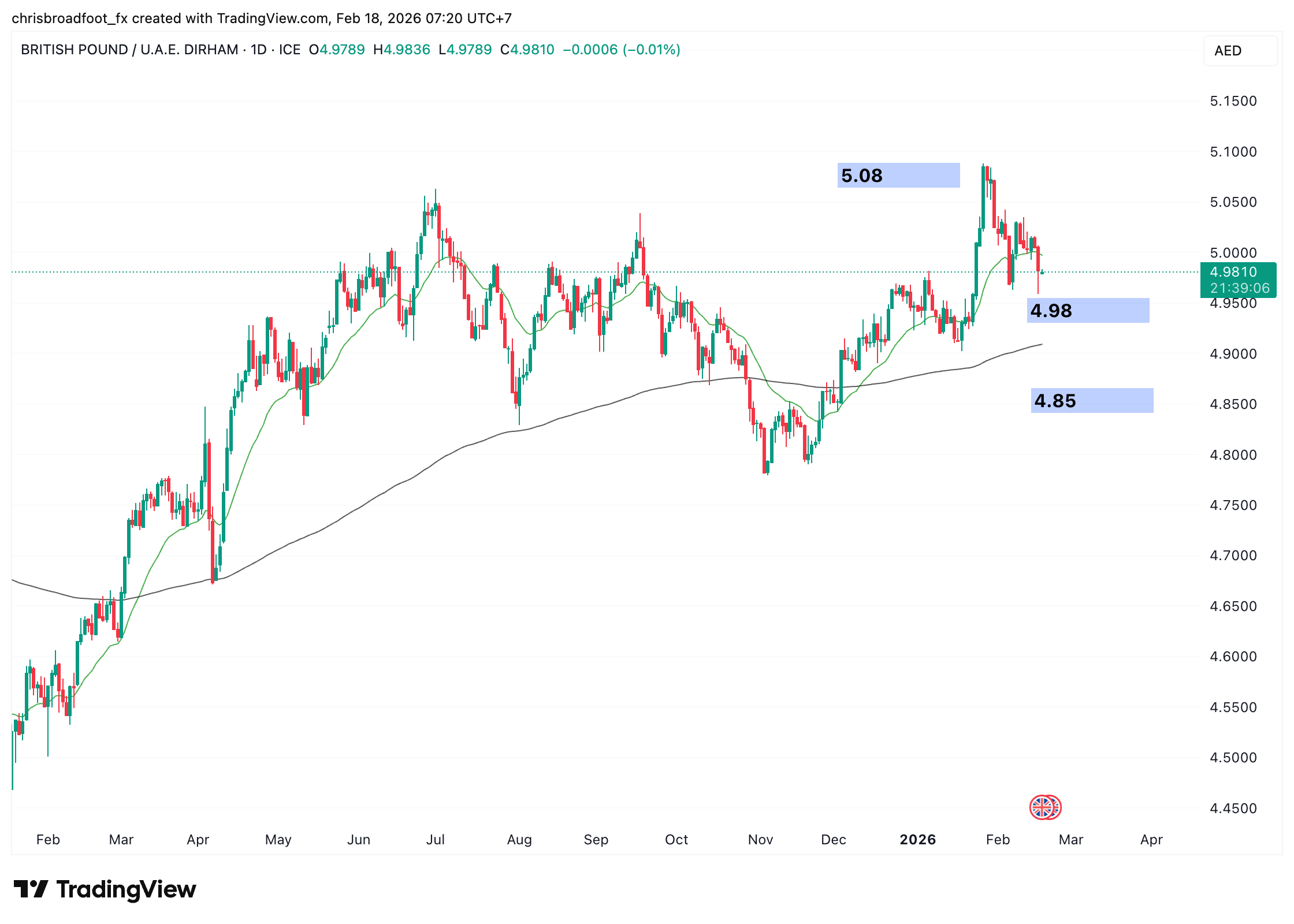 In two weeks, GBP/AED has swung from 5.08 to 4.98.